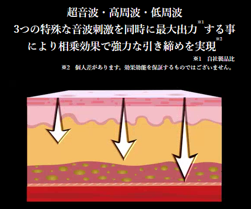 引き締めがより強力なのが、超音波、高周波EMS、低周波EMSの同時出力。